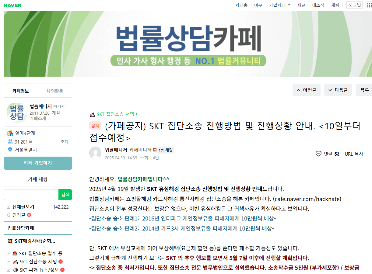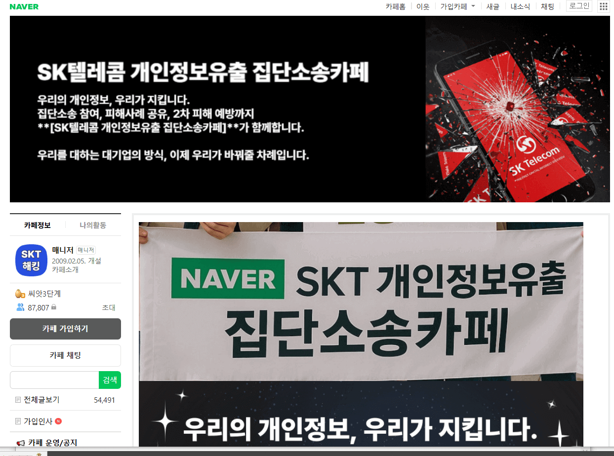 . 피해를 겪으셨다면 혼자 고민하지 마시고 지금 당장 SKT 집단소송카페에 함께하세요!